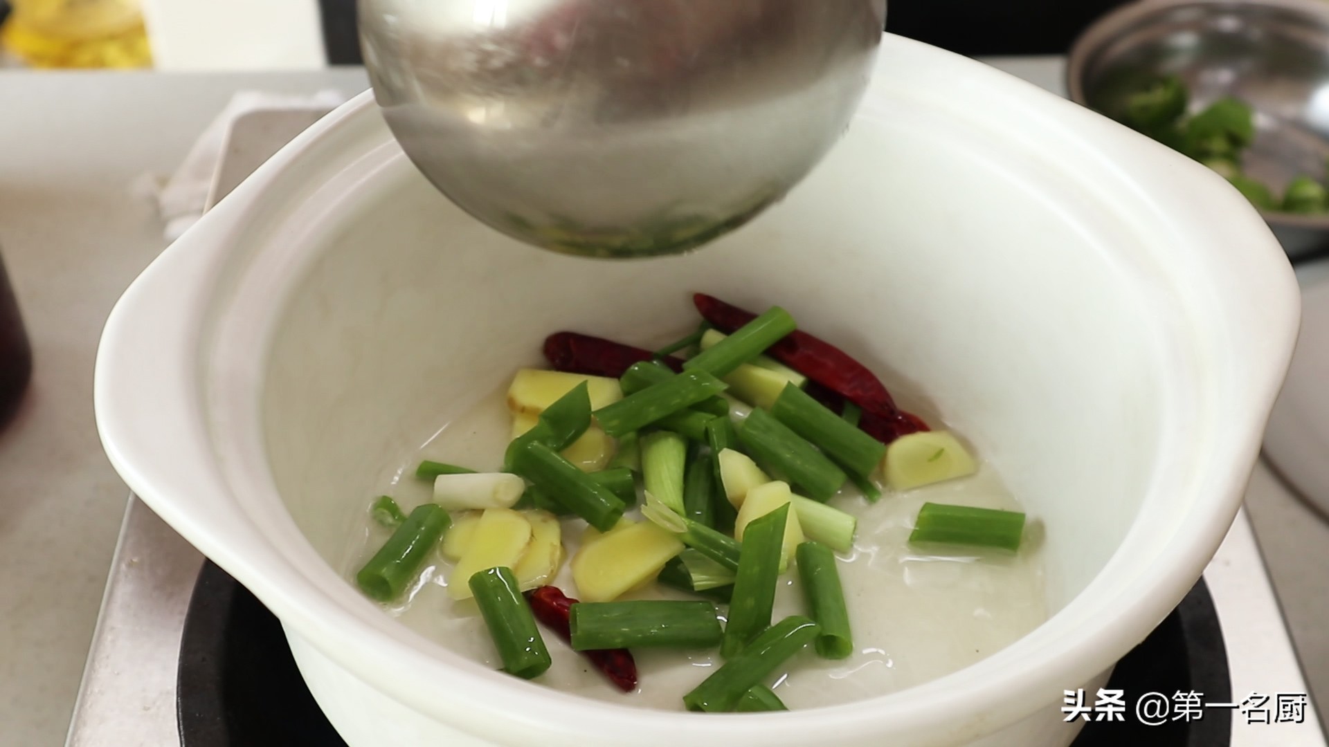 8.准备一个砂锅,烧热以后添入少许食用油,放入葱姜红干椒爆香。
