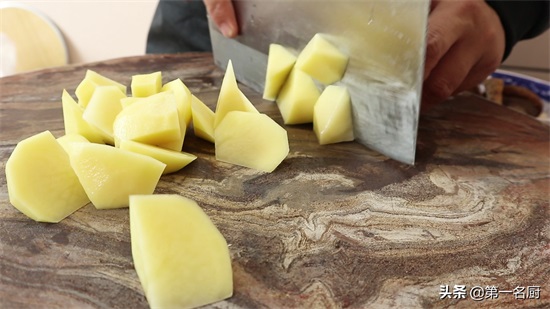 2.准备削皮的土豆一个,先从中间切开,再切成滚刀块,放入盘中。