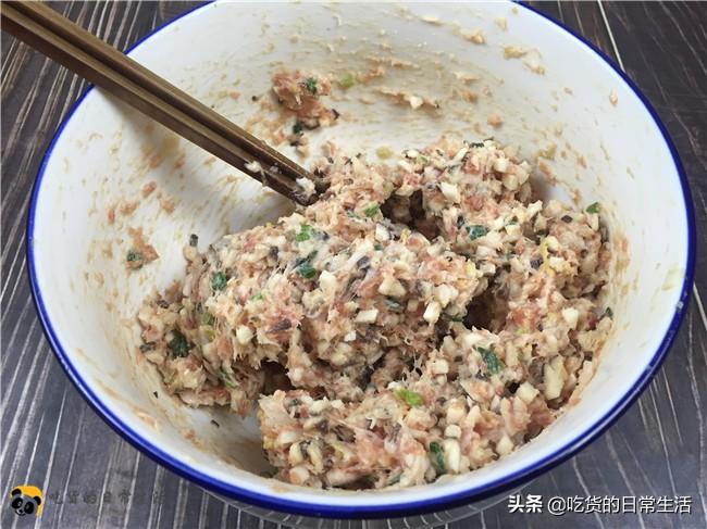 2、在肉末中倒入料酒、香油、生抽、姜末、葱末,然后再倒入适量的水,朝着一个方向搅拌,要多搅拌一会儿,充分的给肉馅上劲,这样做出来的肉馅才会细嫩可口。