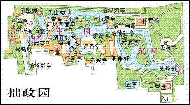 “拙政”二字取自晋代潘岳《闲居赋》中“筑室种树,灌园鬻蔬,是亦拙者之为也”之意,通俗讲,就是说我自己归隐田园,养养花,种种树,浇浇菜,这也不失为一种“笨拙人”的处世之道。王献臣用此自比,表明自己想过恬淡生活的心境。