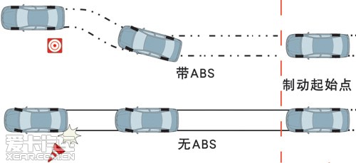 ABS(Anti-lock Brake System)直译中文为防止刹车锁死,也就是防抱死系统。在很早以前,经常可以看到捷达车的后屁股上贴有该字母,现在我觉得应该所有车都有这个最基本的系统了吧,作用就是在采取紧急制动时,防止车轮直接抱死不动,造成失控,同时可以在紧急制动的同时,采取相应打方向盘避让障碍物。可以减少紧急制动对轮胎磨损,简短制动距离,更有效的避让障碍物。