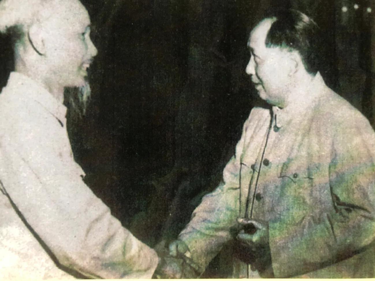 毛泽东主席会见越南胡志明主席。两位领袖紧握双手,拉开了援越抗美战争的序幕。