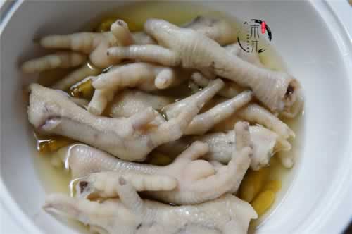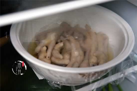 3、鸡爪煮到刚刚熟透,投入冷水收紧。捞出控水,投入料水中。