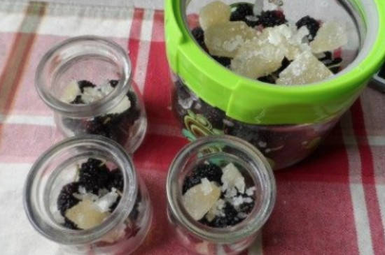 2、将桑葚放入盐水中浸泡10分钟后,用清水清洗干净桑葚并晾干水分,同时将干净的玻璃瓶消毒。之后将桑葚果和冰糖放入玻璃瓶内。