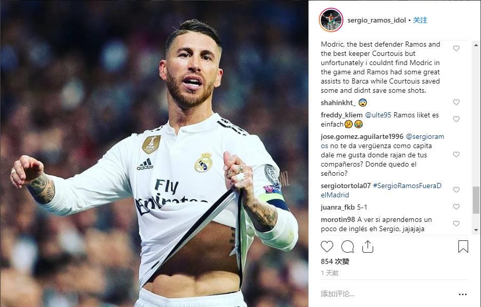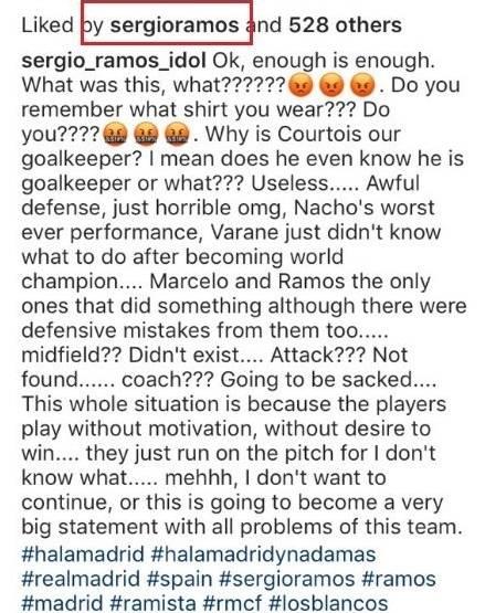 直播吧10月31日讯 皇马在国家德比中惨败于巴萨,世界各地的皇马球迷对于球队的表现十分不满,在ins上一位球迷发长文点评皇马德比战的表现,拉莫斯给这条ins点赞了。
