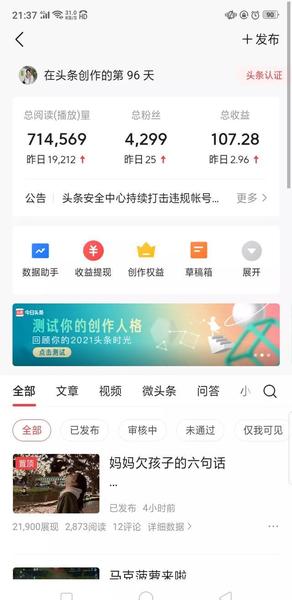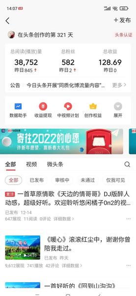 今天是我在头条创作的第321天,收益128.69元。我这128.69除了0.12是微头条收益剩下的全是西瓜视频收益。其实我发西瓜视频一开始收益为零或者分角,我也曾经徘徊要不要放弃,直到10月份我制作了一个《秋天不回来》的音乐视频,播放量1200,平台给了18.71元,这对我可是高收益了,也大大鼓舞了我坚持发视频,也终于等到提现标准。总之,创作不易,没有捷径,要不断学习再学习,最重要的就是要坚持。