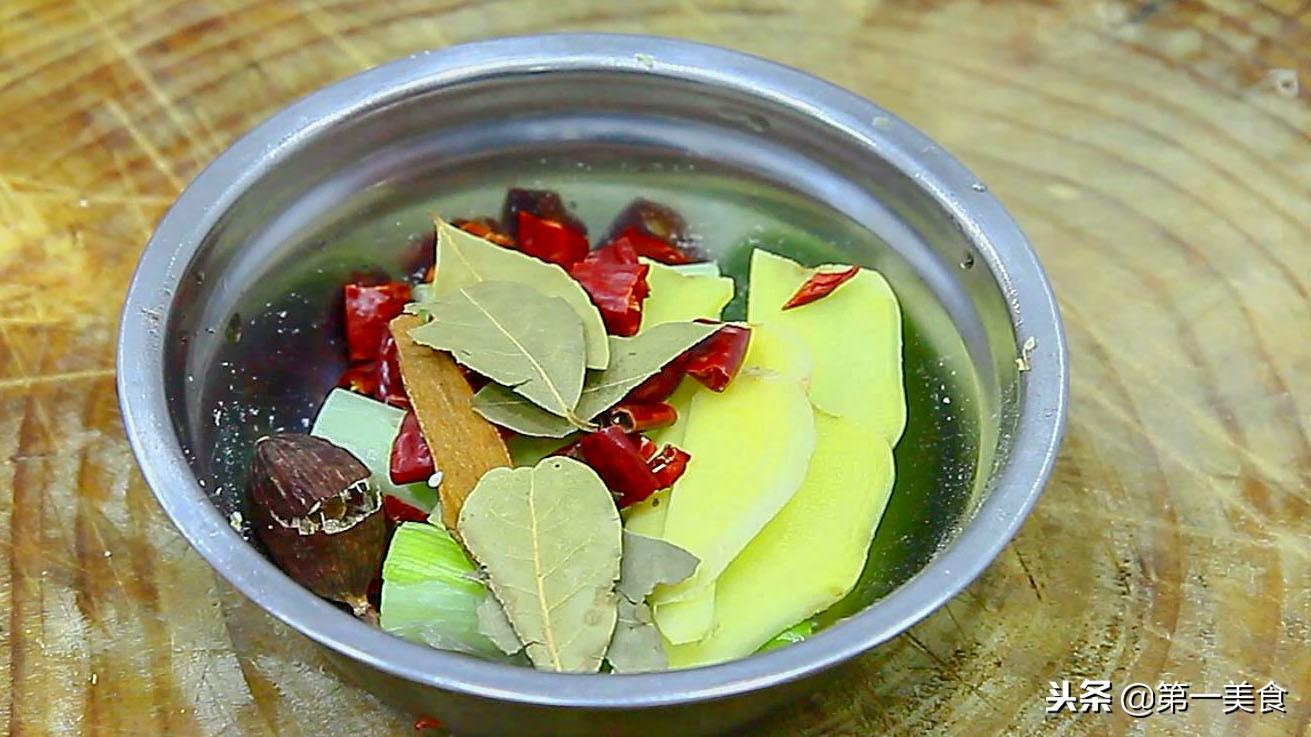 大葱白切成段,生姜切成姜片,八角两粒,干红椒一小把,桂皮一片,香叶几片,草果一粒拍扁。
