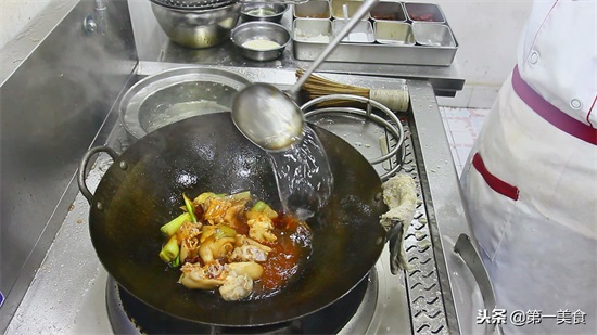 倒入辣椒酱,海鲜酱,炒出辣椒酱的红油,倒入料酒,利用料酒挥发的特性可以减少猪蹄腥味,翻几下以后,倒入清水,水的高度要没过猪蹄。