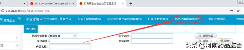 1.登录行政审批系统,在页面顶部右上角点击“颗粒化事项编码维护”链接,如下图