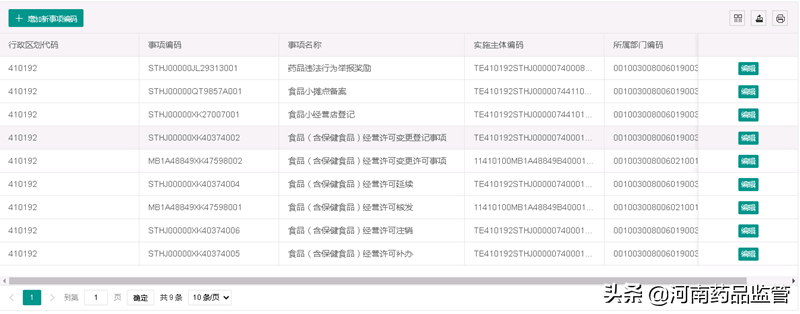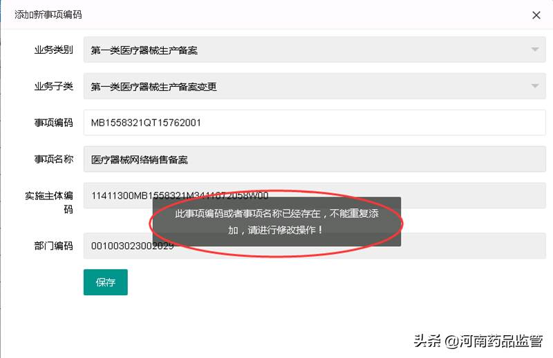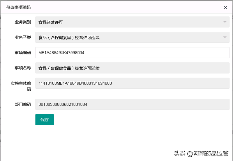 点击保存,如提示”业务编码已存在”,请关闭此窗口,返回主页面,找到要新增的事项名称,点击编辑操作,弹出修改页面