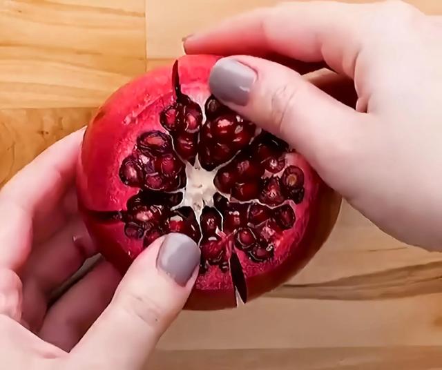 3、石榴在天灵盖上划一刀,再大全沿着筋膜划几刀,掰开,用力敲打它的屁股,很快你就得到一盆吃到爽的石榴粒啦。