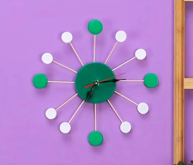 16、在这样的大圆盖上钻小孔,插上另一头有小瓶盖的木棍,钟表制作简单又漂亮小学三年级,装上钟表零件,这样子的钟表仅此一款。
