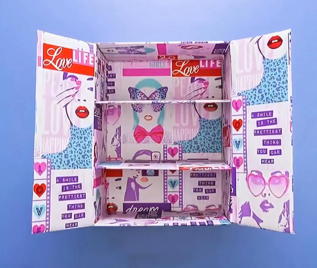 13、剪去纸盒工艺两边,贴上小学生贴纸,装好隔层,秒变儿童化妆品收纳盒。
