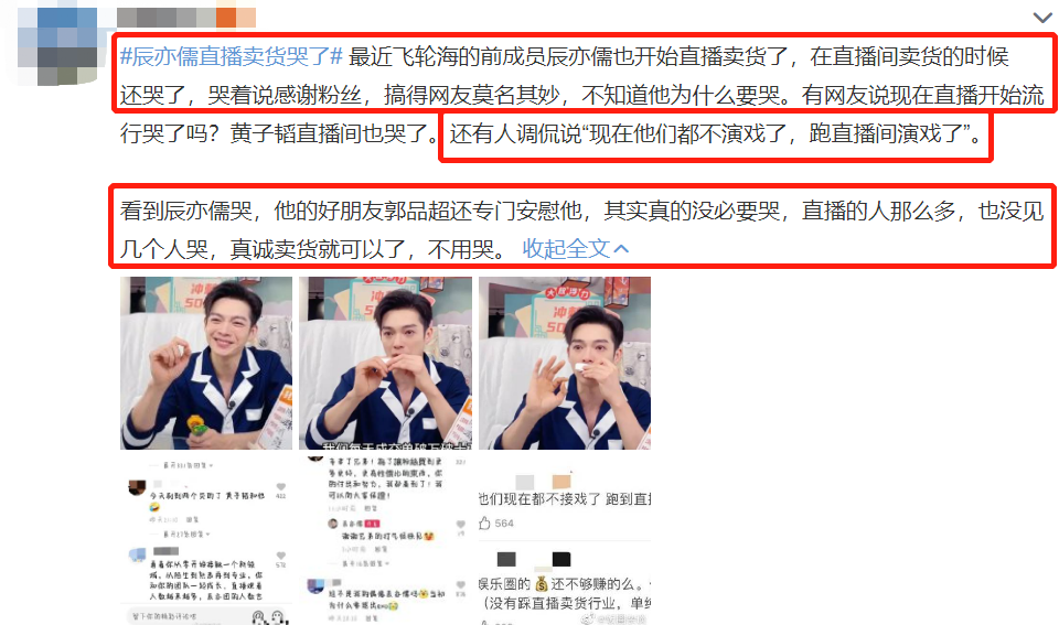 近日,关于飞轮海成员辰亦儒最近在直播带货,却突然哽咽爆哭引发全网热议和关注。不少网友吐槽明星带货都开启演技大比拼模式,带货泪洒直播间,旁边的工作人员也心疼大呼:“你不能这样”,不少网友也纷纷调侃当年红极一时的男团成员如今怎么都沦落到痛哭带货了!
