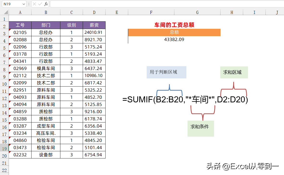 公式:=SUMIF(B2:B20,"*车间*",D2:D20)