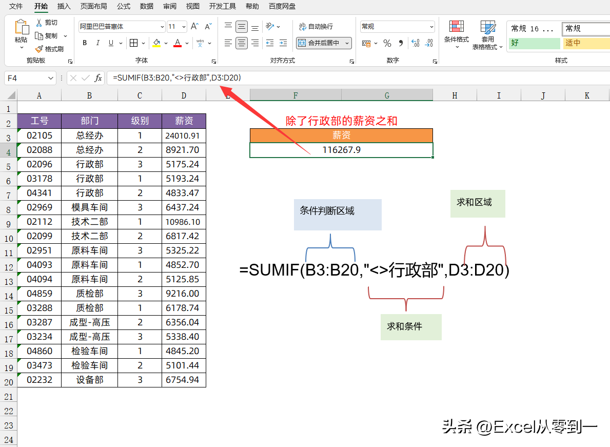 公式为:=SUMIF(B3:B20,"<>行政部",D3:D20)