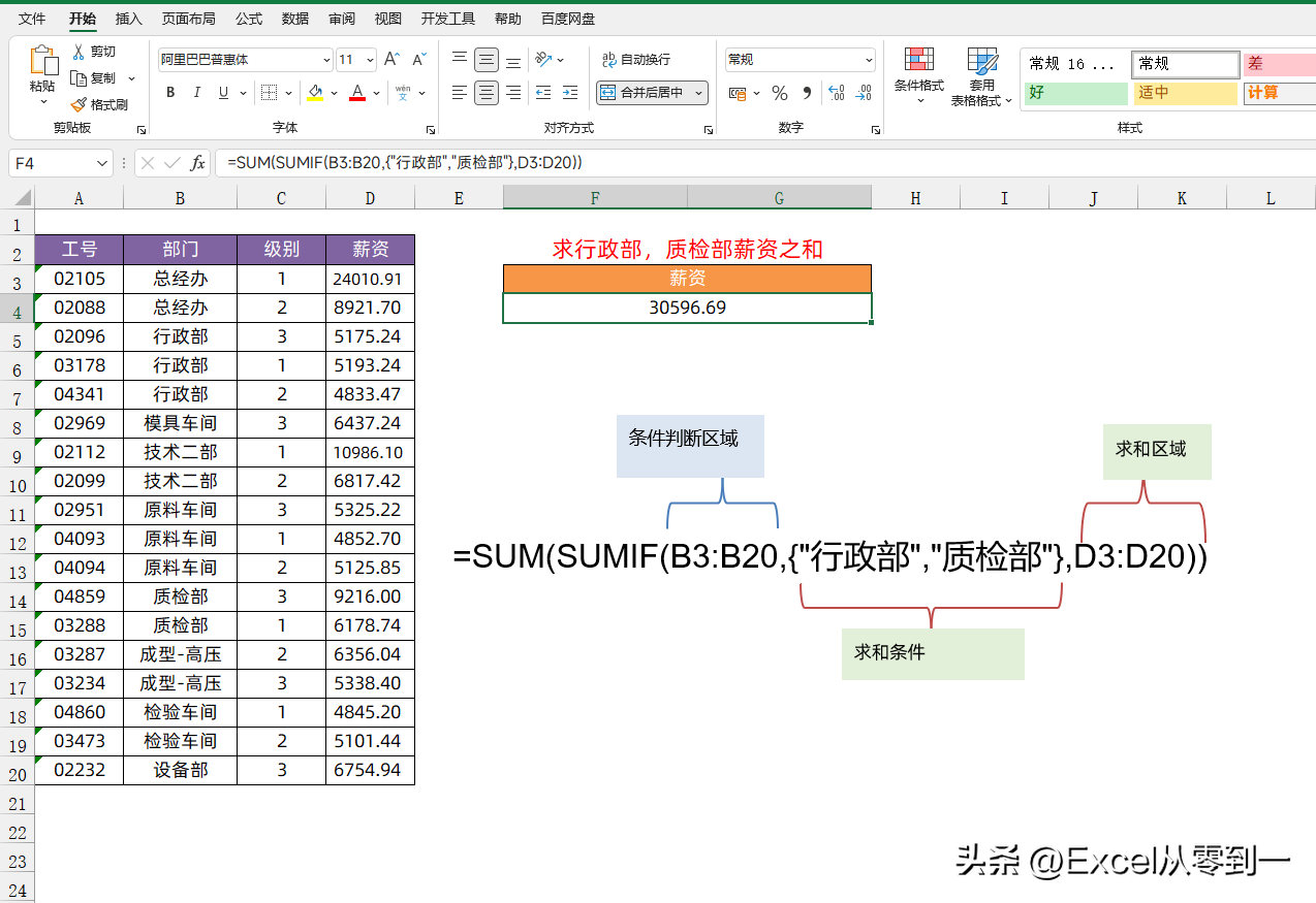 如下图所示,我们想要求【行政部】和【质检部】的薪资总和,就是一列中有2个条件。