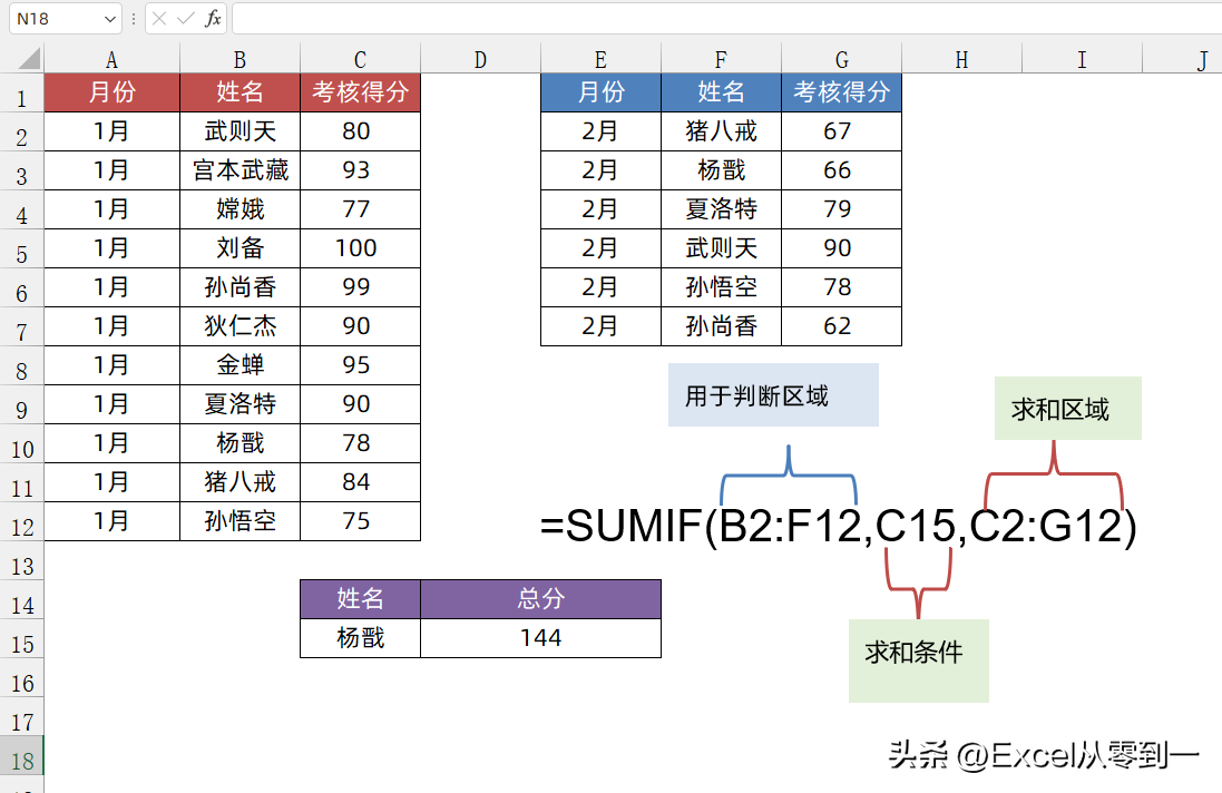 很多人的印象里sumif函数仅仅只能计算一个数据区域,其实它是可以进行多个重数据区域的计算的,比如在这我们想要计算下杨戬1月与2月的考核总分