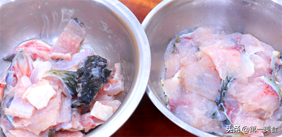 然后把鱼骨剁成小块,鱼肉斜刀片成薄片放入盆中,加入食盐和啤酒抓洗出里面的血水,再用清水洗去鱼块上的血渍和盐分。