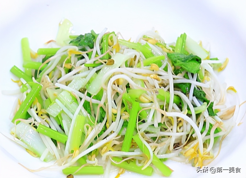 锅内烧水,加入少许食盐入底味,水烧开以后放入绿豆芽和小香芹烫一会,再放入小白菜继续煮30秒钟,把配菜煮至八成熟时倒出来放入盘中垫底。