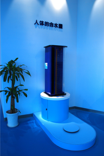 图中展项通过透明容器装载水来实际展示人体内的含水量,使游客对人体中的水分含量有直观的认识。从而了解人体内部组织的组成含量。操作说明:游客选择性别按钮,在称重处称重,观看互动设备了解自己身体的含水量。