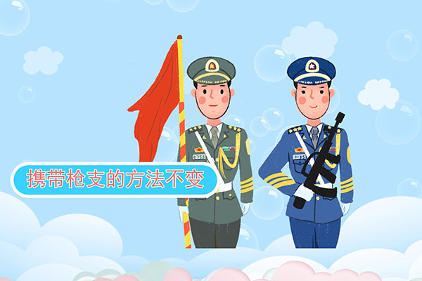当携带着枪炮时收到稍息的口令,携带枪支的方法不变,其他动作与徒手听令相同。稍息的口令表示从立正姿势换为休息姿势,通常是一个科目完成后的最后一个动作。