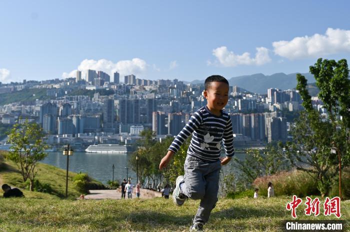 一位小朋友在宁江渡公园奔跑玩耍。中新网记者 何蓬磊 摄