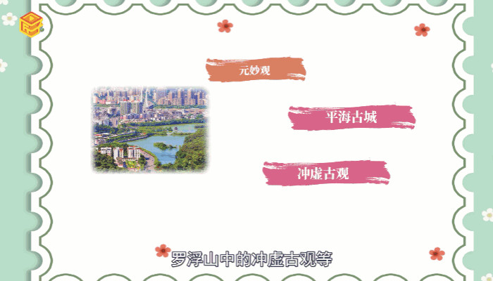 主要景观有平湖北畔的元妙观、惠东平海镇的平海古城、罗浮山中的冲虚古观等。其中元妙观是中国三大著名道观之一,观内分前后两殿,前为玉皇殿,后为三清宝殿,两殿以天井相隔,依走廊相通。此外,冲虚古观是一座四合院式的建筑,它大门楹联上刻着“典午三清苑,朱明七洞天”的文字,内部有众多宏伟宫殿,比如三清宝殿等。
