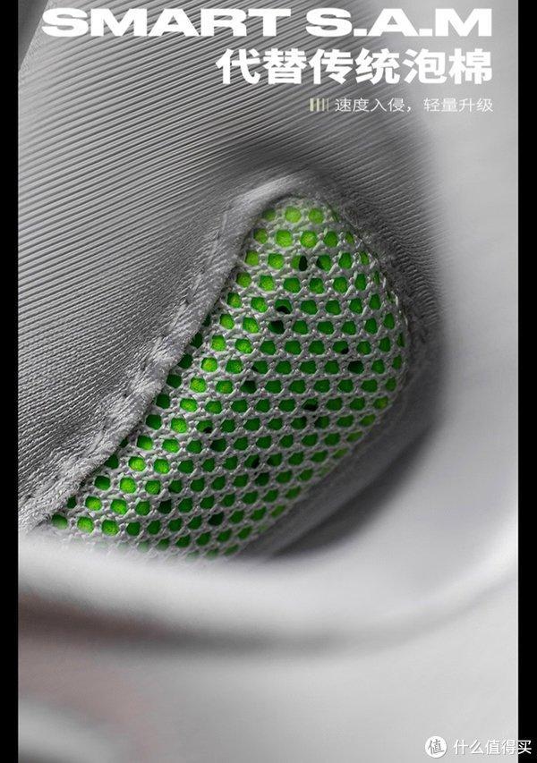中底搭载全掌安踏氮气科技,采用PEBA泡棉材料打造极致轻盈的脚感,密度仅0.09g/cm?。安踏还首创了尼龙弹性体子胚发泡工艺,在超临界状态下通过氮气物理发泡,带来高回弹的缓震效果,能量回归率达86.8%。中底的抗形变能力也进一步增强,落地更加稳定性,耐久性提升了30%。它的后跟采用类似汽车进气格栅的设计,透过镂空处可以看到氮气科技中底。后跟内侧采用两块SMART S.A.M填充,以锁紧后跟和脚踝部位。