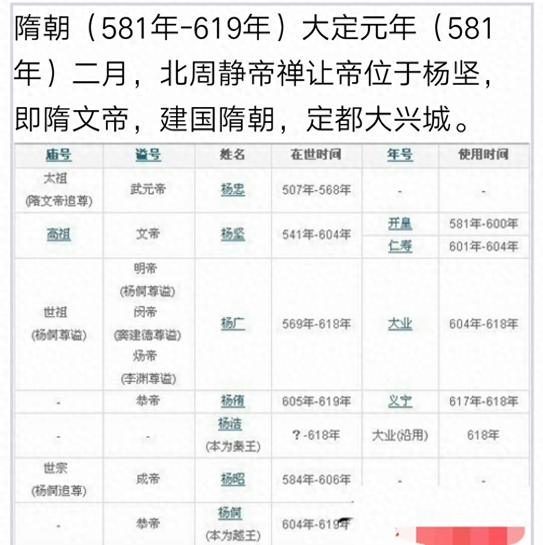 隋朝(公元581年-619年),始于文帝杨坚,终于炀帝杨广,共2帝。杨广后虽还有恭帝(617.11-618.5)在位,秦王浩(618.3-618.9)在位,皇泰帝(618.5-619.4)在位,但他们都是傀儡皇帝,且在位时间极短,故在此不被列入。隋朝结束了中国南北朝时期的分裂局面,使中国又形成大一统的王朝。