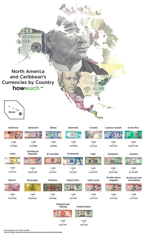 先从最近的北美国家开始,最高币值的是开曼群岛元,1美元等于0.82开曼群岛元。最低的是海地货币古德,1美元等于61.4古德。