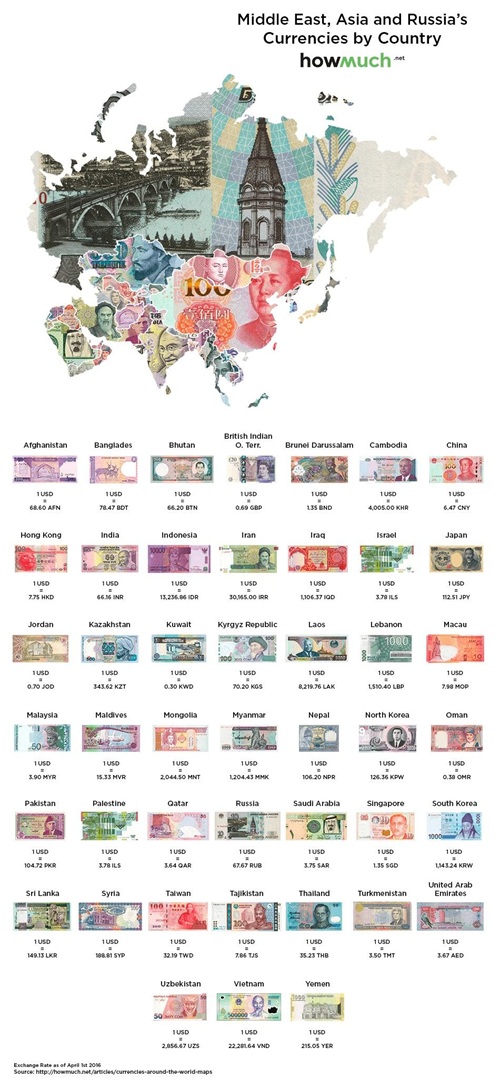 亚洲45个国家(原作者把俄罗斯算在内),最强势的货币是科威特第纳尔,1美元才能够兑换0.30第纳尔,最弱势的伊朗里亚尔,1美元=30165伊朗里亚尔。