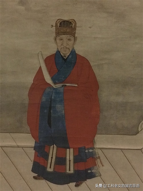 这张是“黄道周待漏图”,国家博物馆“妙合神形--中国国家博物馆藏明清肖像画展”中展出的明代官员黄道周画像。黄道周是天启、崇祯时期的官员,官至礼部尚书,二品官了。“待漏” ,官员上朝,须待铜壶漏尽、宫门开启。明代官员或名仕画肖像画经常采用“待漏图”这种形式,这种画像能体现出礼制、官制、服饰与人物形象相融合的特征。