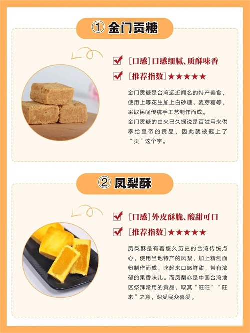 除了茶叶,台湾还有很多其他的特产,比如花生糖、凤梨酥、肉松饼等等,每一种都有着自己的独特魅力。花生糖香甜可口,凤梨酥酥脆爽口,肉松饼味道丰富,简直让人回味无穷。