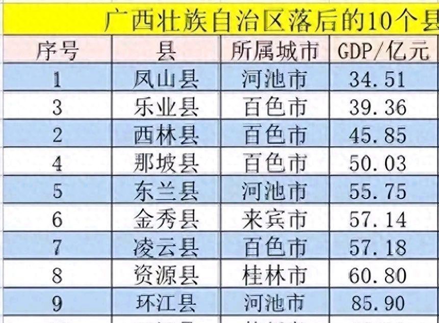 广西落后的10个县均未达到百亿的GDP水平,其中排名第一的是凤山县。凤山县的经济发展受到了交通和人口稀少的限制。道路狭窄、缺乏养护,使得交通不便,难以将农产品销售到更远的市场,也使得招商引资的机会十分渺茫。同时,地理位置偏远,当地的年轻人口大量外流,使得经济发展的人才储备变得十分匮乏。凤山县的社会服务短缺,加剧了其经济发展困难。为了改变这种局面,凤山县需要从交通和人口这两个关键问题入手。广西落后的10个县中,百色市4县居于榜单之列。其经济落后状况与地理位置和人口流失密切相关。百色市位于广西壮族自治区西南部,虽然与经济较为发达的珠三角地区相邻,但距离核心经济区域较远,交通相对不便,吸引外来投资和人才方面处于相对劣势。由于远离主要市场,百色市的贸易成本相对较高,进一步限制了其经济发展。经济状况不佳,许多有能力的年轻人选择离开百色市前往其他城市,导致了百色市的人才流失严重。