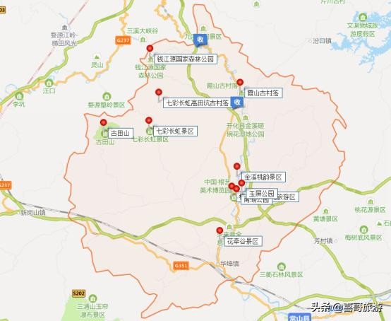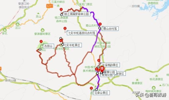 2、开化县十大景点自驾游行程路线:开化县-玉屏公园-南湖公园-根宫佛国文化旅游区-花牵谷景区-金溪桃韵景区-霞山古村落-钱江源国家森林公园-七彩长虹景区-七彩长虹高田坑古村落-古田山-开化县。