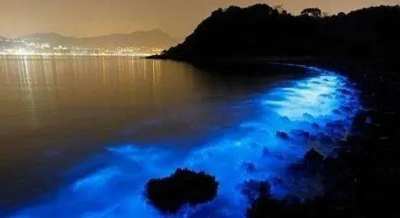 在蚊湾,每升水中大约有20万只这样的发光藻类,它的夜明景象格外突出,任何轻微的搅动都会聚集成群的钩鞭藻。钩鞭藻可将体内的化学能转变为光能扰动愈猛烈,光亮愈显著。顽皮的跺一跺脚,海里的鱼儿四散奔逃,也带着蓝莹莹的光,像四散的流星。亲自进入海里的时候,自己的周围也立刻包围着蓝光,仿佛自己长了天使的翅膀!