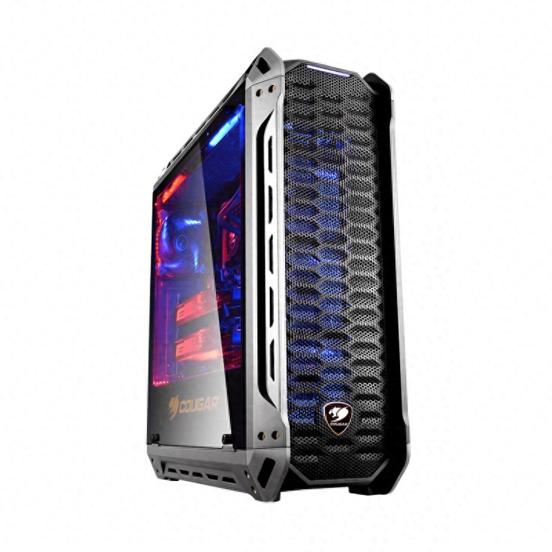 机箱采用的是骨伽Panzer全景透视钢化玻璃水冷机箱,德国精工锻造,两侧全透明钢化玻璃侧窗,全景透视效果一览无遗。机箱内部空间宽敞,7个扩展槽,最多可装3组425mm显卡。可支持高达6个SSD硬盘(或者4SSD+2HDD)。支持4个水冷或8个风扇,组成强大的散热系统。
