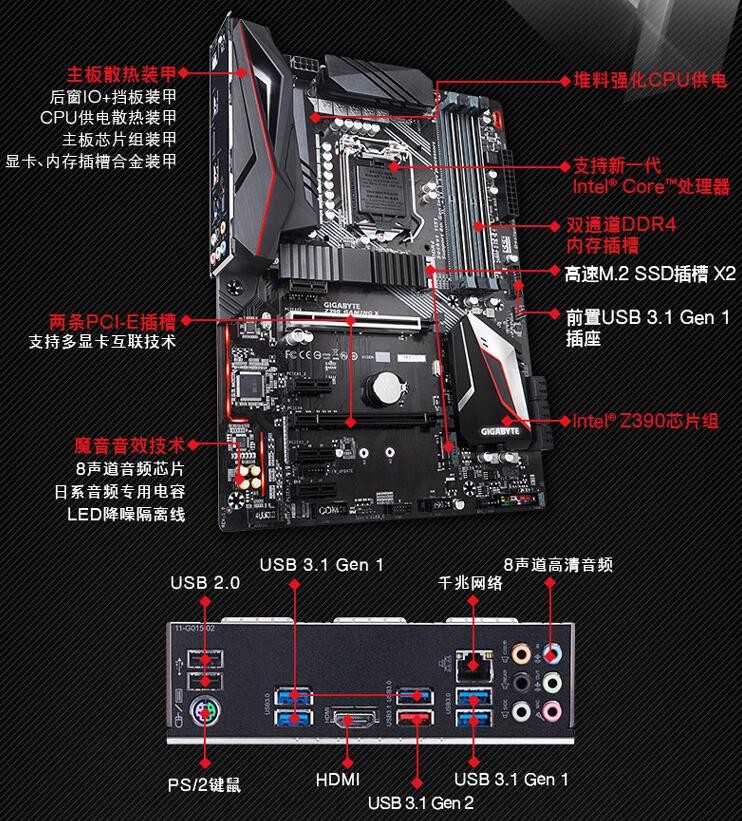 主板采用的是技嘉Z390 GAMING X,是面向游戏玩家的一个系列产品,自带散热装甲,带有RGB多彩灯光系统,CPU供电用料充实使用10+2相数字供电设计,支持双M.2硬盘(其中1个带有金属散热片),带有英特尔的千兆游戏网卡以及ALC892芯片。I/O接口非常丰富,2个USB 2.0、1个PS/2、5个USB 3.0、1个USB 3.1、1个HDMI、1个RJ45以及1组音频接口。