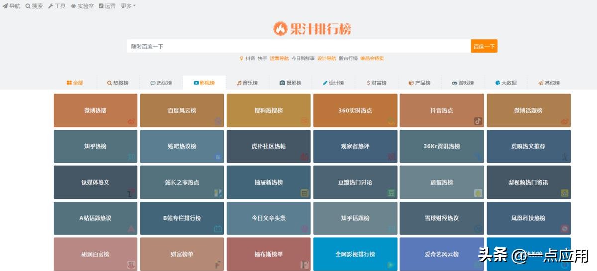 一键式快速查询各类排行榜的网站,囊括了热搜、热议、电影、音乐、摄影、游戏、财富等各大领域的权威排名榜单,可以说几乎能想到的榜单这里都有。虽然站点本身不存储内容,但能通过它来实现各类榜单的快速跳转,信息真的很全。