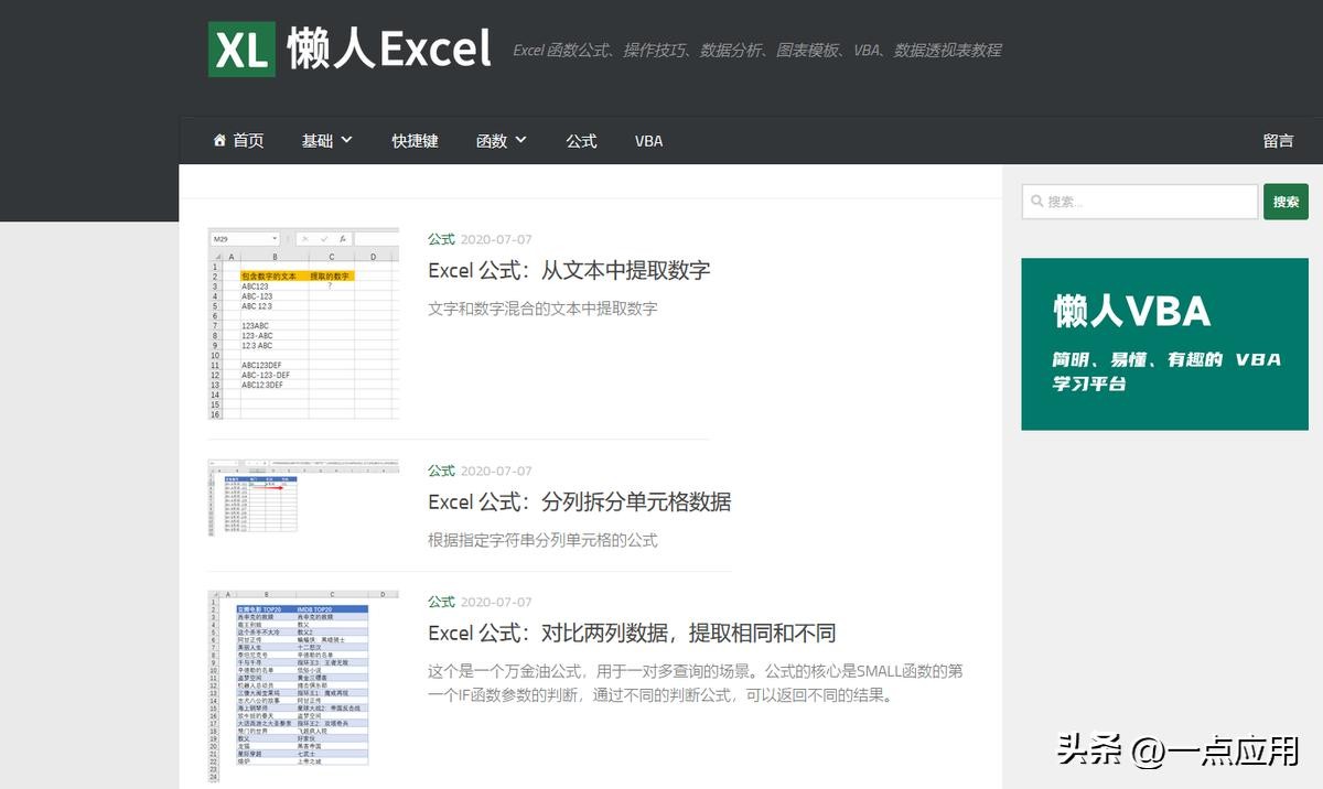 一个可以免费获取Excel知识的网站,界面简洁,资源丰富,涵盖了基础操作、函数公式、数据分析等多个版块,教程也都做到图文结合,零基础也能快速看懂,另外具备强大的搜索功能,输入关键词即可搜索查找,妥妥的懒人福音!