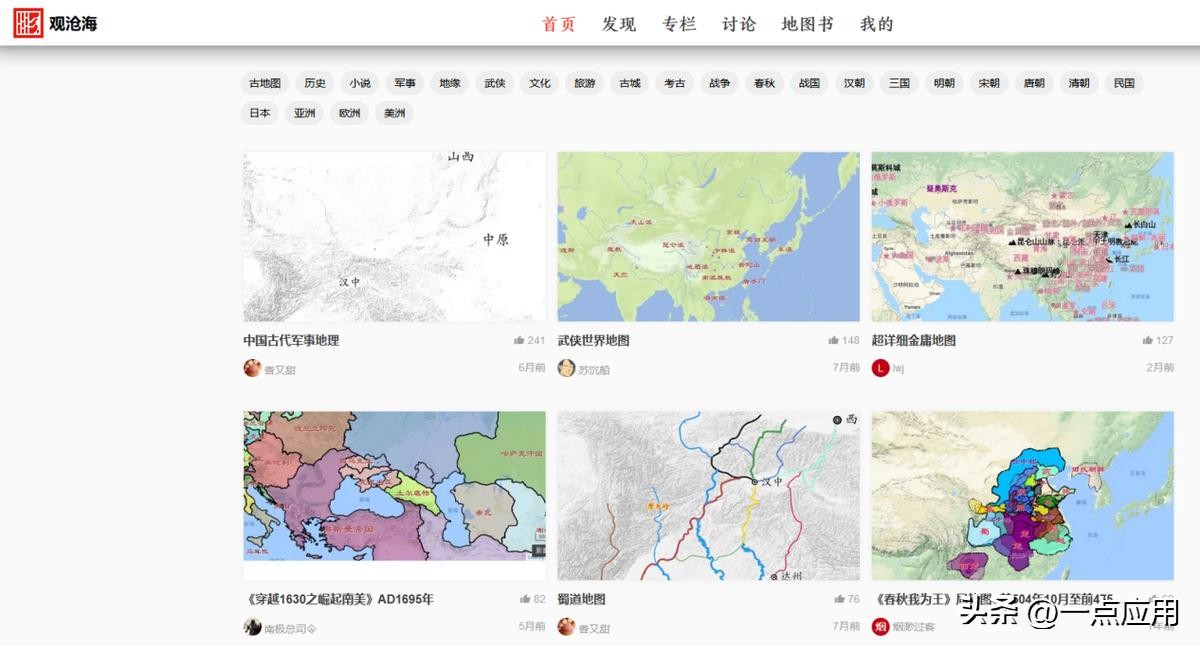 ⼀个提供地图制作分享服务的公益网站,通过将地图和文字结合来反映中国历史、军事、地理、文化等方面的知识,同时了解到一个国家、城市的朝代更替和历史变迁,此外还包含各种趣味地图,也支持创建和编辑专属的个性化地图。