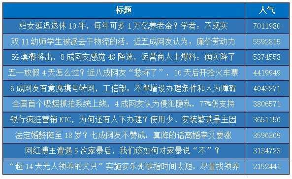 这其中,延迟退休、双11物流、5G套餐、五一放假4天、携号转网、吸烟抓拍、ETC推广、建议下调法定婚龄、家暴和流浪犬安乐死等话题,得到了最多的关注。