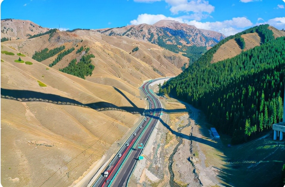 果子沟位于霍城县东北的40公里处,是312国道乌鲁木齐通往伊犁公路的必经通道。塞里木湖就在果子沟北端,到了春夏,这里是新疆西部最美的山谷。时间会从每年的五月下旬持续到9月。登山果子沟的任意斜坡都可以拍到林带和山脊漫无边际的美景。果子沟大桥将大自然的鬼斧神工与人类的科技结晶巧妙地融合在了一起,这样的风景竟然看上去如此的和谐。果子沟绝美的自然风光,险要的地势,桥身腾空而起,穿越崇山峻岭,大气磅礴,身临其境,有一种惊心动魄的美。