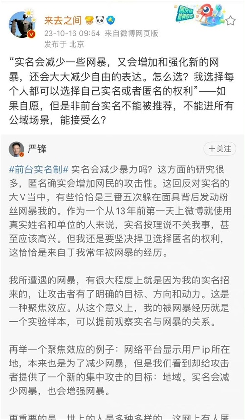 在互联网世界中,匿名性一直是最根本的魅力之一。在现代社会,匿名性成为了个人保护隐私的基础。尤其是在开放性社交平台微博上,由于匿名属性,每个人都可以戴着面具自由发表言论,这使得微博变得嘈杂而喧闹,也不可避免地掺杂了一些偏见和虚假。然而,这种嘈杂和喧闹在一定程度上也是微博的魅力所在。但是,实名制的推行将会改变这种状况。大V们的真实姓名的公开将让他们无法再以匿名身份在微博上发声。这将对大V们的影响巨大,他们可能会面临更多的责任和压力,同时也要面对可能的隐私泄露和安全问题。对于普通用户来说,实名制的推行可能会提升网络言论的质量,减少虚假信息的传播,但也可能限制了一部分人的言论自由。实名制在一些特定领域的推行,如时政、财经、娱乐,可以理解为对舆论的规范和管理。这些领域的信息往往涉及到重要的社会议题、政治敏感问题以及商业利益等,实名制的推行可以增加信息的可信度和透明度,减少不负责任的传播行为。