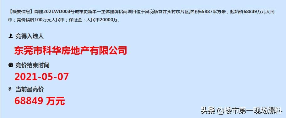 5月7日,东莞今年第四宗“城市更新单一主体挂牌招商”项目,位于凤岗官井头村东片区的更新单元,被万科以6.88亿元夺下!