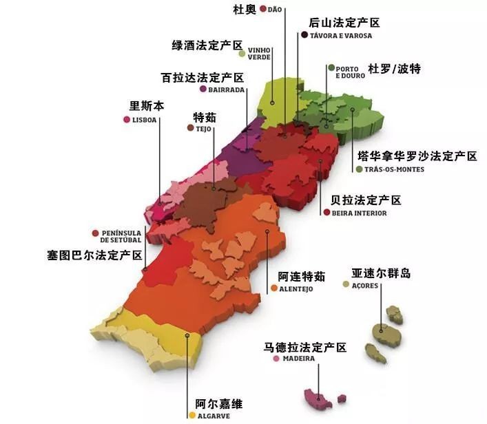葡萄牙的气候十分适合种植葡萄,为温和的海洋性气候,夏季温暖,冬季凉爽潮湿,越往南部和东部,气候越极端。主要有绿酒产区、阿连特茹、贝拉斯、特茹、埃斯特雷马杜拉、塞图巴尔半岛、杜罗河、百拉达、杜奥、马德拉、阿尔加维、亚速尔群岛、后山等13个产区。