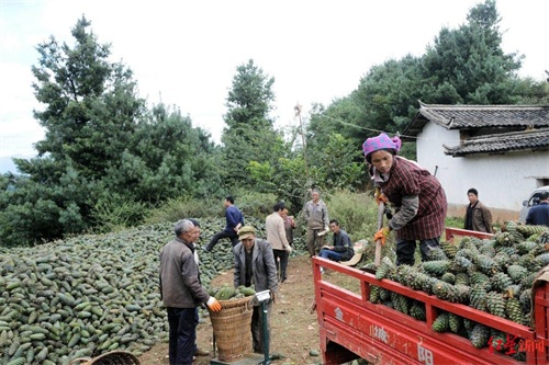 从每年9月开始,会东县堵格镇的华山松林区就格外热闹,或人背、或车运,随处可见忙着采摘华山松塔的村民。