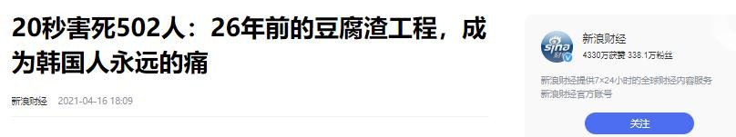 原文登载于新浪财经2021年04月16日关于20秒害死502人:26年前的豆腐渣工程,成为韩国人永远的痛的报道
