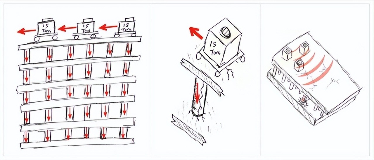 这也就导致本身楼上的压力就已经完全超过了该承受的重量,而这几个冷却塔的安装,无疑是增重了许多,毕竟当时加上冷却水,就有87吨左右,这已经完全是一个“危房”,随时都增加了倒塌的风险。